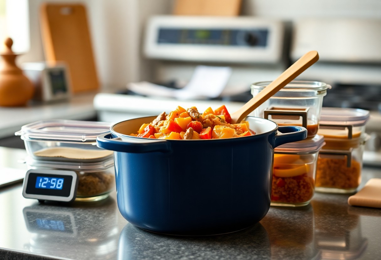 You should also manage cook times and ingredient prep: par-cook dense items, use canned beans to skip long soaking, and opt for quick-cooking grains like quinoa when time is tight; for specific swaps, use garlic-infused oil for low-FODMAP needs and replace cream with Greek yogurt or blended white beans to cut fat while keeping body and protein.